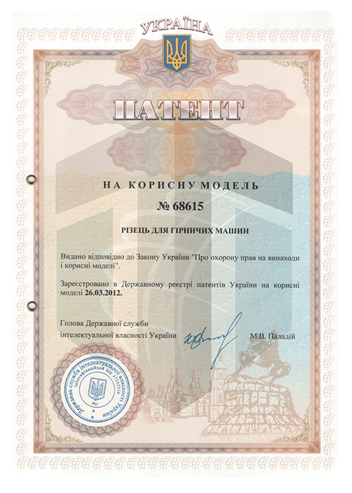 礦用截齒實(shí)用新型專(zhuān)利證書(shū)